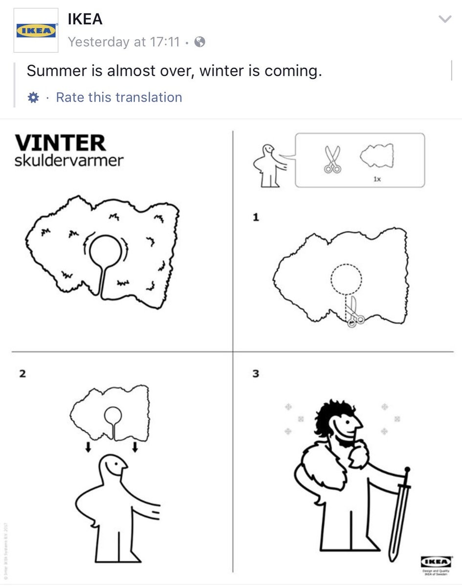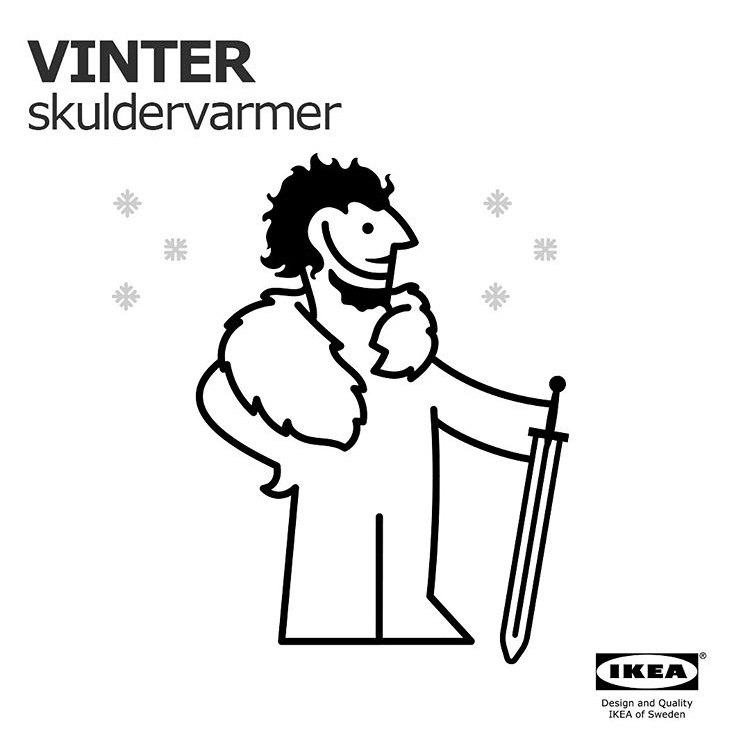 Агентство SMFB Oslo вместе с IKEA опубликовало инструкцию, руководствуясь которой можно превратить коврик из овечьей шкуры ЛУДДЕ в плащ Vinter Skuldervarmer – вроде того, что используют члены «Ночного дозора» в сериале «Игра престолов». Стоимость коврика магазине IKEA сегодня составляет 100 белорусских рублей.