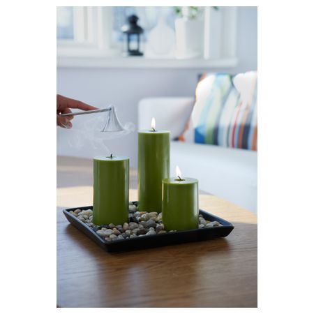Гасит пламя свечи безопасно – без брызг и гари. Свечной колпачок на шарнирном соединении; одинаково удобно гасить свечи в фонарях и канделябрах. Длина: 24 см. Основные части: Алюминий. Ручка: Нержавеющая сталь.