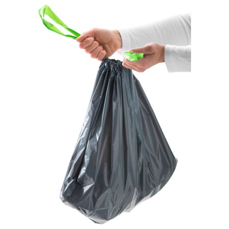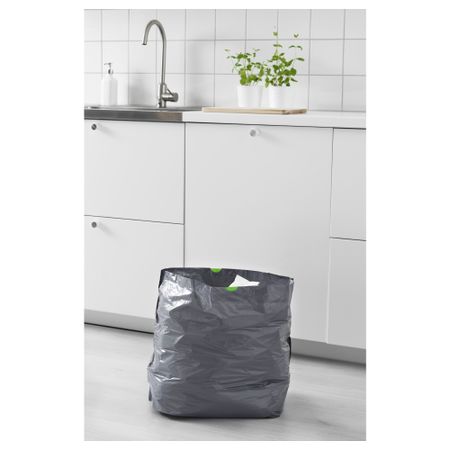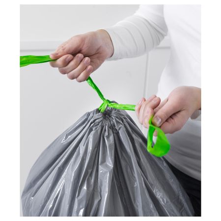 Благодаря завязке по верхнему краю мешок удобно закрыть и вынести. Благодаря плоскому дну полный мешок будет устойчиво стоять на полу. Размер: 21 л