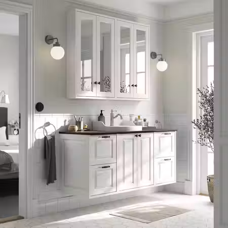 Удачная комбинация для хранения самых разных вещей: более крупные предметы можно положить на полки шкафов, а всё остальное — в выдвижные ящики. Столешница с двумя раковинами и свободным пространством в центре идеально подходит для общей ванной