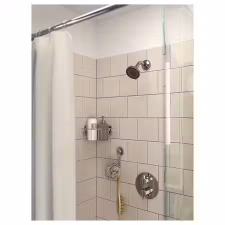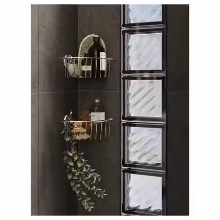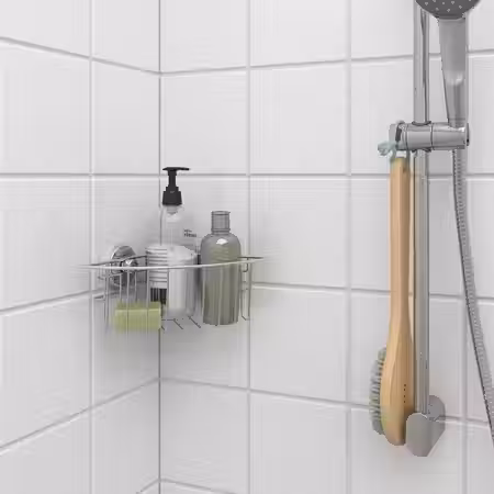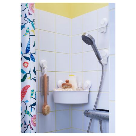 Корзина и полка КРОКФЬЁРДЕН позволят вам удобно разместить в душе шампуни и мыло.