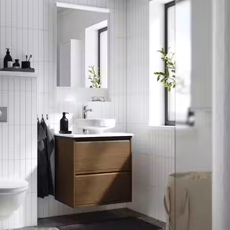 Мебель для ванной ЭНГШЁН выглядит современно и лаконично с минимумом деталей.