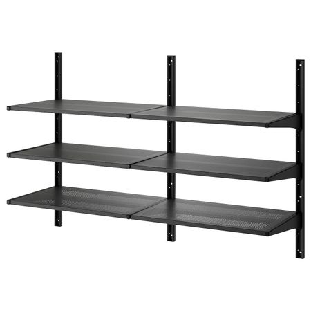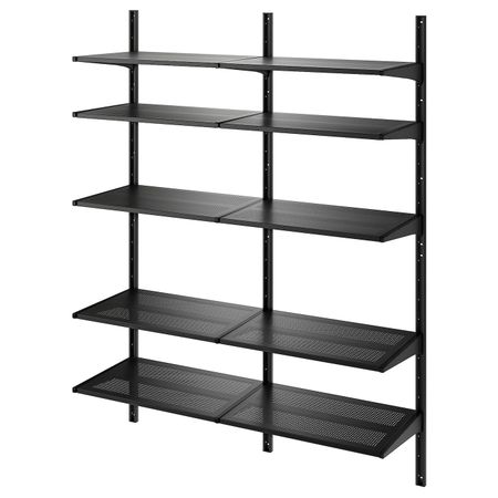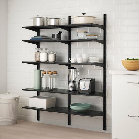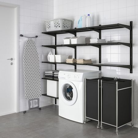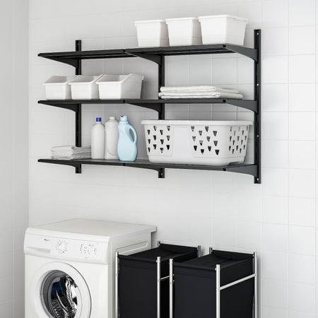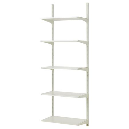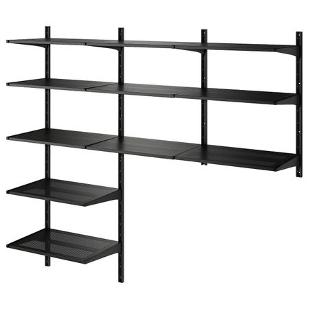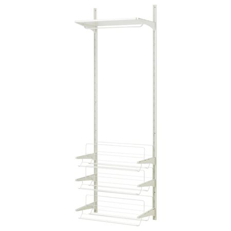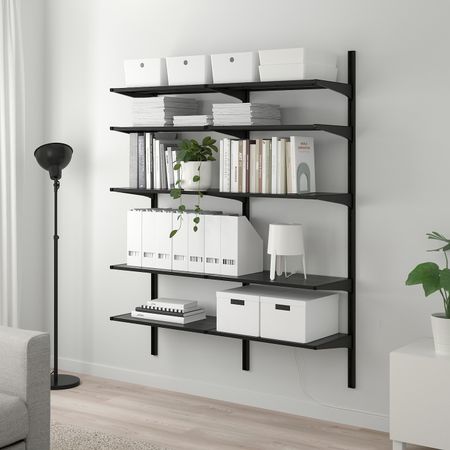 Шины АЛЬГОТ – основа настенной комбинации для хранения. Консоли АЛЬГОТ, на которые вы можете установить полки или другие аксессуары, вставляются в настенные шины до щелчка. Никакие инструменты не нужны.