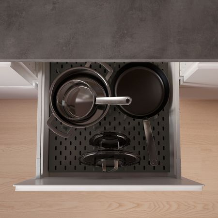 24 съемных колышка позволяют легко регулировать внутреннее пространство выдвижных ящиков в соответствии с хранящимися в них предметами — тарелками, кастрюлями, крышками или контейнерами для продуктов.