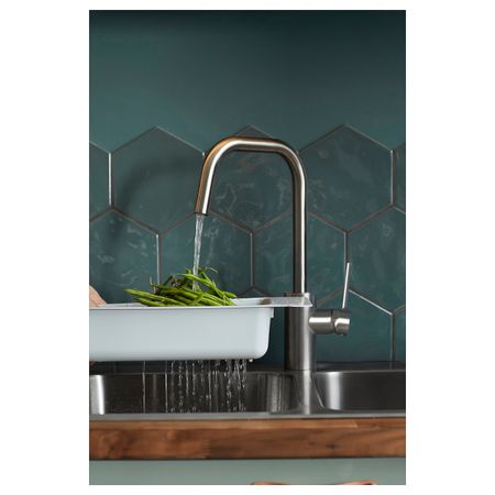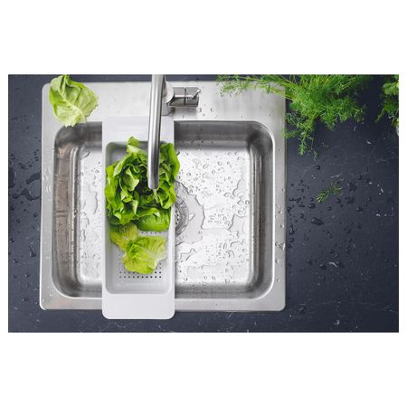 Этот дуршлаг устанавливается на мойку, что позволяет использовать его для мытья овощей и фруктов, в качестве посудной сушилки или для хранения аксессуаров для мытья посуды.