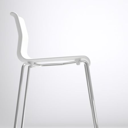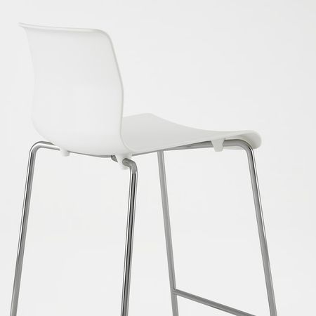 Удобный барный табурет с лаконичными очертаниями выполнен в белом цвете с хромированными элементами.