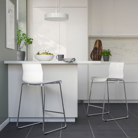 В дизайне серого барного стула ЛИЛЛЭНЭС современный стиль сочетается с комфортом сиденья с мягкой набивкой и удобной спинкой.