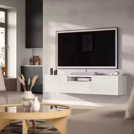 Много места для хранения и отверстия для проводов: эта навесная тумба под ТВ объединяет три каркаса в стильное и функциональное решение.