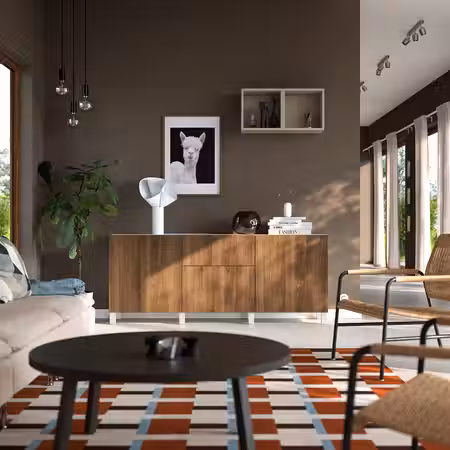 Много места для хранения и отверстия для проводов: эта навесная тумба под ТВ объединяет три каркаса в стильное и функциональное решение.