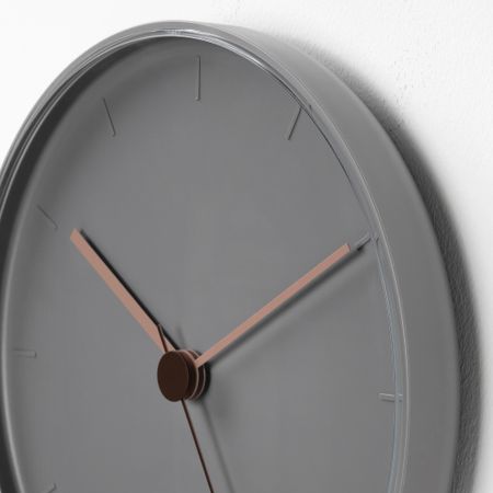 Часовые отметки сливаются с серым фоном, но благодаря розовым часовой и минутной стрелкам вы всегда легко определите время. Благодаря лаконичной форме и нейтральному серому цвету часы будут прекрасно сочетаться с другими предметами интерьера.