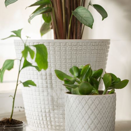 Выразительный тактильный орнамент подчеркнет природную красоту ваших растений.Изделия их прочной каменной керамики прослужат вам долгие годы. Отличный материал для кашпо и других предметов для повседневного использования.