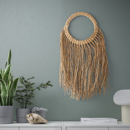 Благодаря естественным переходам цвета каждый товар из банановых волокон получается уникальным. Настенное украшение ИГЕЛЬCТОРП — прекрасный пример нашего сотрудничества с социальными предпринимателями. Оно сплетено вручную из банановых волокон.