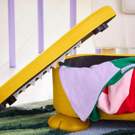 Этот пуф с отделением для хранения будет отлично смотреться и в детской, и в гостиной. Дети могут сидеть на нём и скармливать ему игрушки, а взрослые — использовать его в качестве табурета для ног. А если