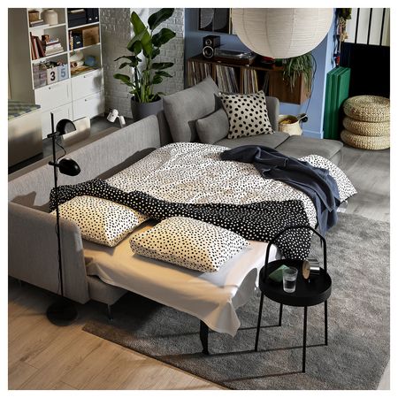 Когда эти две кровати стоят одна на другой, это односпальная кровать или диван. А по отдельности они могут служить двуспальной кроватью, угловым диваном или двумя отдельными кроватями. И их всегда можно снова объединить, чтобы освободить место