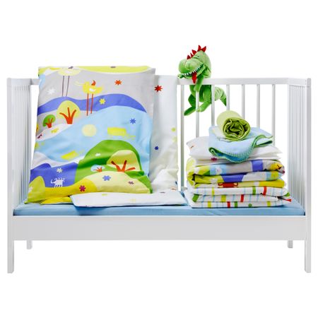Хлопок – мягкий и комфортный для ребенка материал. В набор входит: 1 натяжная простыня (120x60 см), 1 пододеяльник (125x110 см) и 1 наволочка (55x35 см). Размер: 110x125/35x55 см