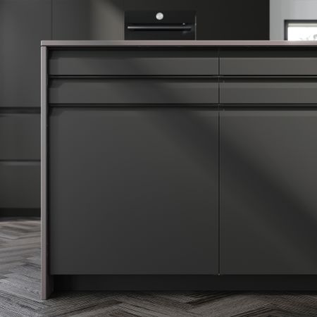 Скошенный край и окрашенная в тот же цвет металлическая ручка ловят отблески света и создают уникальный облик. Встроенная алюминиевая ручка черного цвета сливается с передней поверхностью, придавая всему дизайну современный и графичный вид.