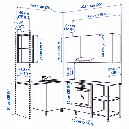 Высота навесного шкафа:220 см Высота напольного шкафа:91 см Глубина:61 см Ширина правый:183 см Ширина левый:182 см Размер и вес упаковки 2 упаковки сифон/выпуск д/одинарной мойки LILLVIKEN Номер товара: 103.115.