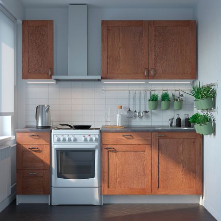 Вы можете выбрать готовую комбинацию или создать индивидуальное решение, комбинируя модули КНОКСХУЛЬТ.Отличное бюджетное решение для кухни среднего размера с отдельно стоящей плитой.