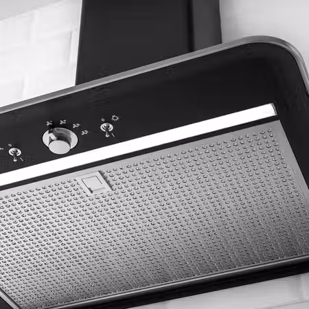 Эта чёрная вытяжка с мягкими скруглёнными краями и переключателями в стиле ретро придаёт кухне традиционный вид.