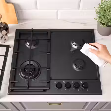 Газовая варочная панель со смелой черной отделкой и электроподжигом, который включается поворотом ручки.