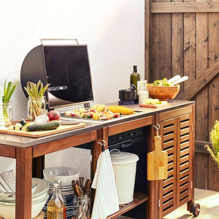 Товары серий ЭПЛАРО и КЛАСЕН создают практичную зону для приготовления блюд на гриле, а также обеспечивают место для хранения посуды и аксессуаров для гриля.Прочную поверхность полки из нержавеющей стали легко поддерживать в чистоте.