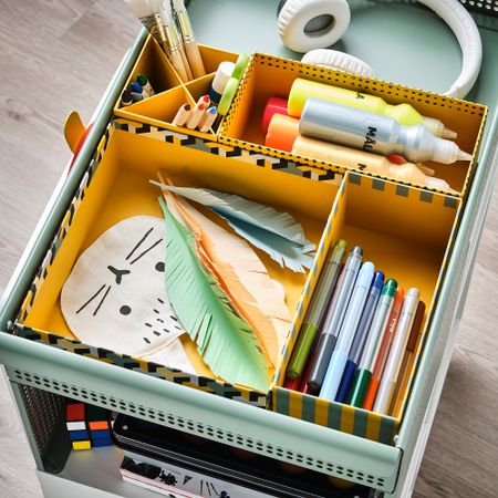Отличное решение для хранения различных мелочей: канцелярских принадлежностей, косметики и аксессуаров для волос. Подходит для стеллажей БИЛЛИ и других стеллажей глубиной не менее 18 см. Легко собрать и сложить, если коробка вам пока не нужна.