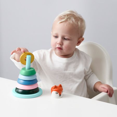 Ребенок может надевать кольца на мягкую палку и одновременно учиться различать цвета и формы.
