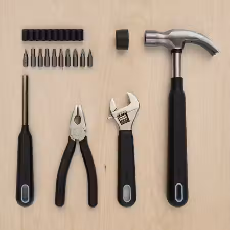 Практичный набор инструментов, необходимых в каждом доме.Молоток может быть использован как резиновая киянка, так как прилагается отдельная резиновая насадка.Инструменты с удобными ручками из мягкого синтетического каучука.
