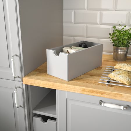 Этот ящик можно поставить в открытый шкаф, а также на рабочую поверхность или обеденный стол. Фетровые накладки позволяют бесшумно двигать ящик и защищают поверхность, на которой он стоит, от царапин.