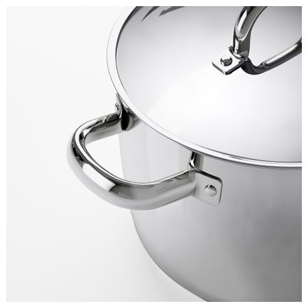 Крышка с защелкой, благодаря которой легко слить воду через отверстия в крышке. Благодаря удобным ручкам посуду легко поднимать и переносить. Толстые стенки и дно равномерно распределяют тепло. Сделано из алюминия. Размер: 5 л