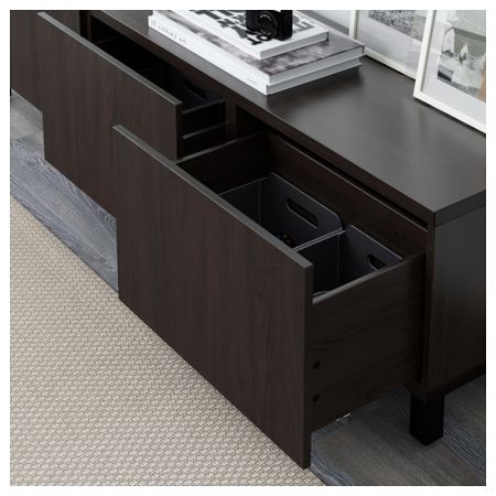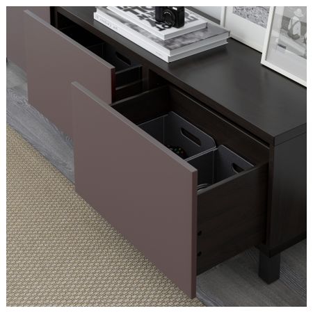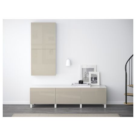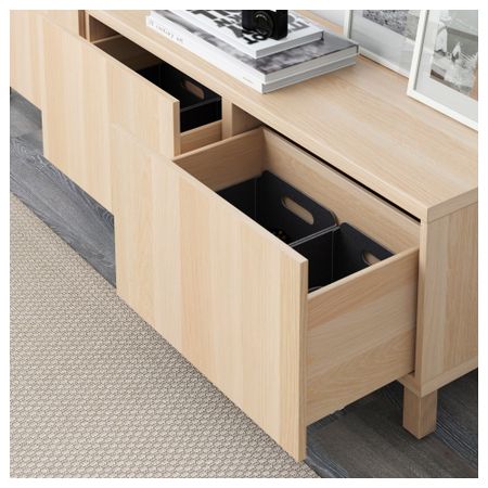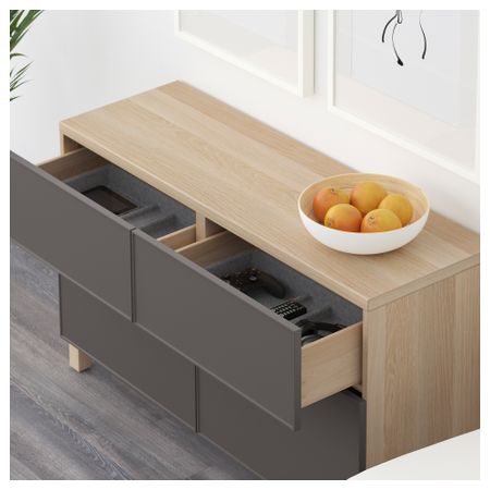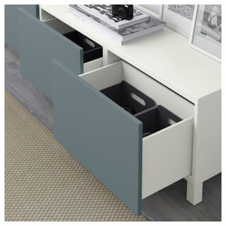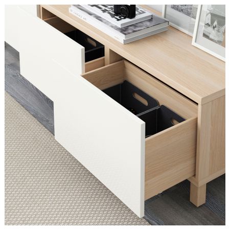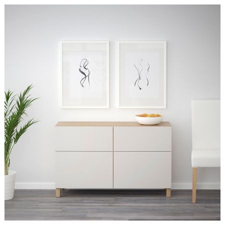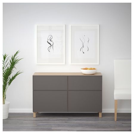 Благодаря доводчикам ящики и дверцы закрываются плавно и бесшумно. Ножки придают комбинации БЕСТО более легкий вид, поднимая модули на полом. Кроме того, это упрощает уборку. Два ящика и полки за дверцами обеспечат достаточно места для хранения. Размер: 120x40x74 см