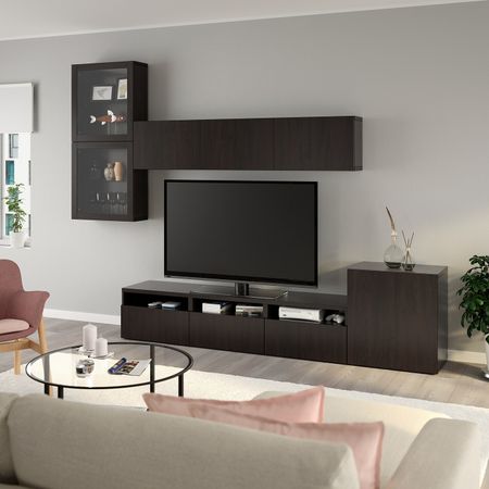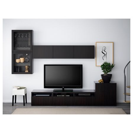 Шкаф для ТВ, комбинированный, стекляные дверцы БЕСТО, под беленый дуб Грундсвикен, темно-серый прозрачное стекло