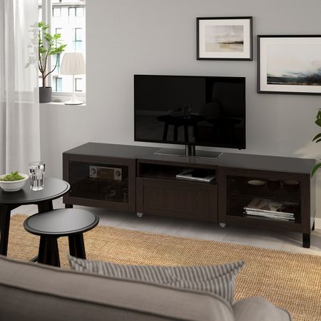 Шкаф для ТВ, комбинированный, стекляные дверцы БЕСТО, черно-коричневый, Вальвикен серо-бирюзовый, прозрачное стекло