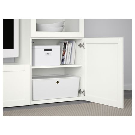 Благодаря интегрированному нажимному механизму ящики и дверцы открываются легким нажатием. Пульт дистанционного управления работает через стекло. Настенные шкафчики позволяют эффективно использовать пространство над телевизором.