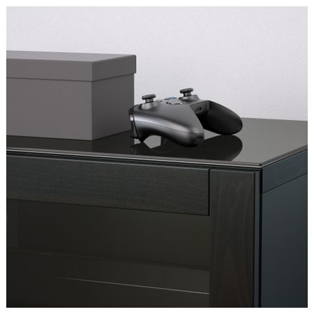 Благодаря интегрированному нажимному механизму ящики и дверцы открываются легким нажатием. Панель из закаленного стекла защищает верхнюю панель тумбы под ТВ и делает ее стильной. Размер: 240x40x230 см