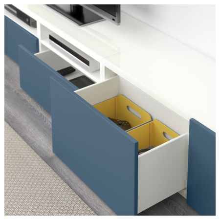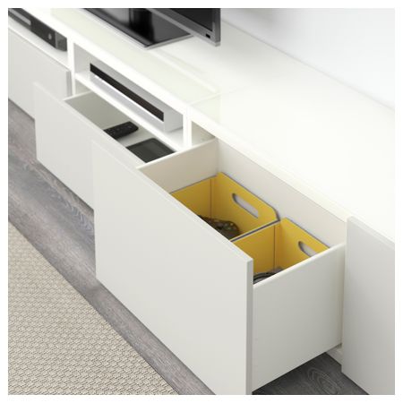 Благодаря интегрированному нажимному механизму ящики и дверцы открываются легким нажатием. Панель из закаленного стекла защищает верхнюю панель тумбы под ТВ и делает ее стильной. Размер: 240x40x230 см