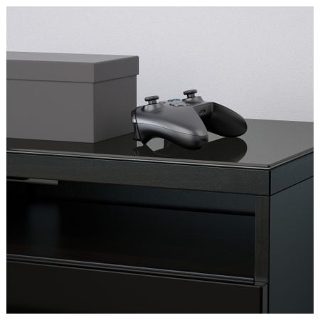 Благодаря доводчикам ящики закрываются плавно и бесшумно Панель из закаленного стекла защищает верхнюю панель тумбы под ТВ и делает ее стильной. Размер: 120x40x48 см