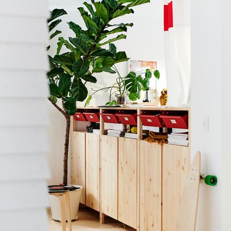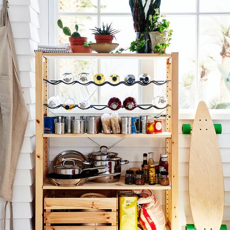 Двери устанавливаются на боковые стойки стеллажа — простой и эффективный способ организовать закрытое хранение и придать стеллажу новый облик.Бамбуковое плетение в середине двери можно легко заменить постером или картиной.