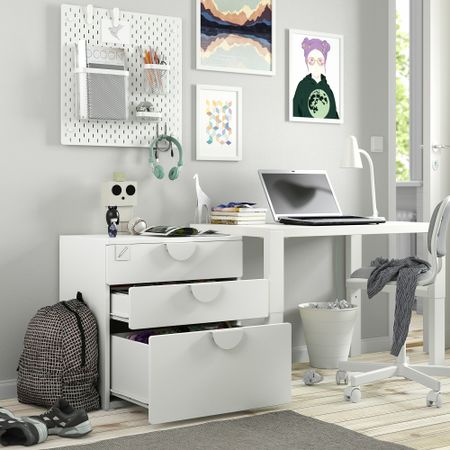 Благодаря доводчикам ящики закрываются плавно и бесшумно. Ножки делают комбинацию БЕСТО визуально легче, приподнимая модули над полом. Кроме того, такое решение упрощает уборку под шкафом. Три вместительных ящика обеспечат порядок в хранении.