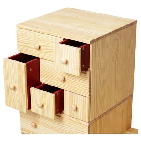 Массив дерева – прочный натуральный материал. Ящик с плавным ходом и стопором. Ящики изнутри покрашены в красный цвет. Для разных стен требуются различные крепежные приспособления. Подберите подходящие для ваших стен шурупы, дюбели, саморезы и т. п. Размер: 130x48x109/133 см