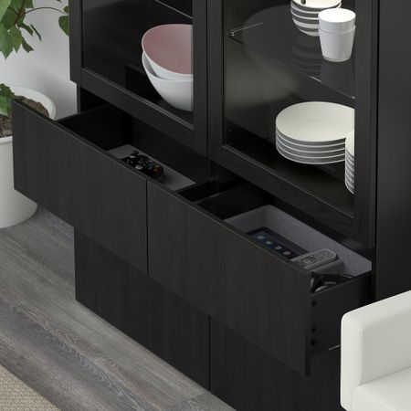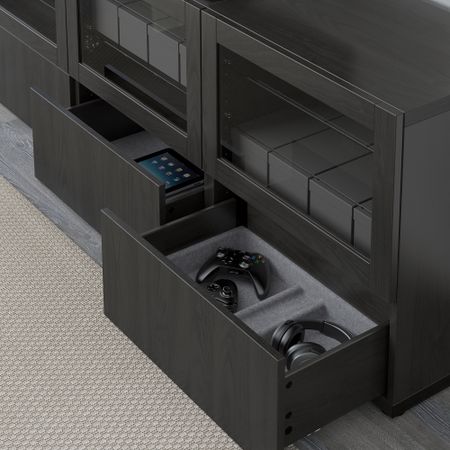 Благодаря доводчикам ящики закрываются плавно и бесшумно. Благодаря нескольким отверстиям на задней панели тумбы под ТВ провода от телевизора и других устройств всегда будут под рукой, но не на виду.