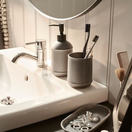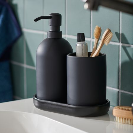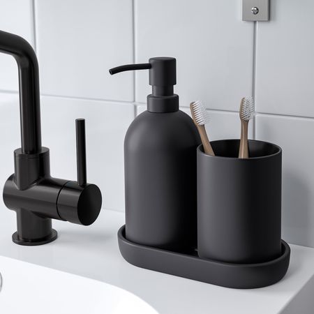 В этом наборе есть все необходимое: дозатор для жидкого мыла, стаканчик для зубных щеток и даже маленький поднос.На поднос можно поставить мыльницу или положить украшения и другие мелочи, которые обычно так легко теряются.