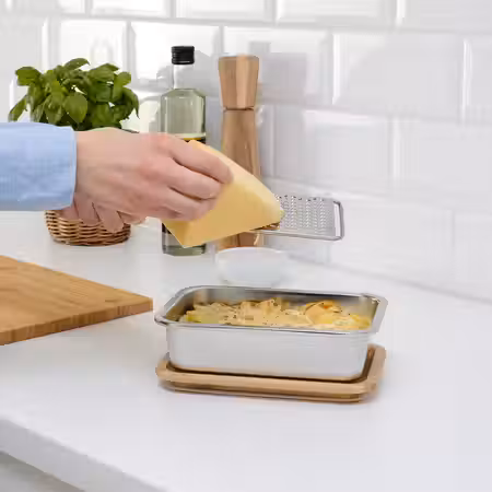 Накройте прямоугольный контейнер из серии ИКЕА 365+ герметичной крышкой, чтобы остатки еды в холодильнике дольше оставались свежими.