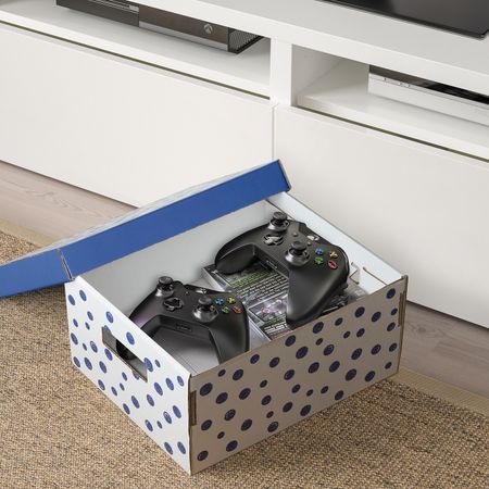Эта большая коробка прекрасно подойдет для хранения игр, аксессуаров для хобби, одежды и даже одеял и подушек.Идеально подходит для стеллажей КАЛЛАКС и другой мебели с полками глубиной минимум 35 см.