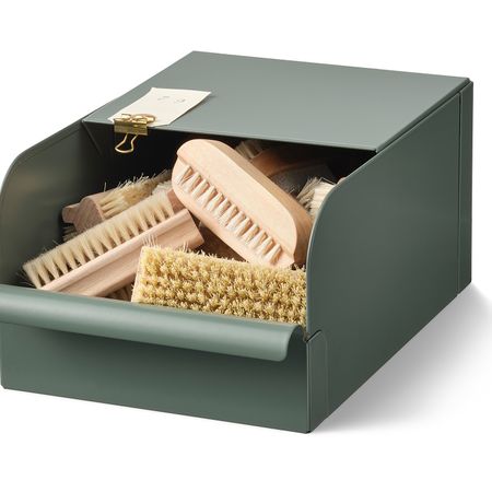 Прочный металлический контейнер с пробковой крышкой, на которую удобно ставить другие контейнеры, не царапая их, чтобы все необходимое было в одном месте. Благодаря отделениям удобно организовать хранение разных мелочей, например ручек и скрепок.