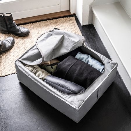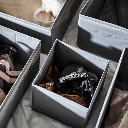 Этот штабелируемый контейнер поможет организовать хранение небольших предметов в гардеробе или стеллаже. Его можно использовать даже в ванной, так как материал, из которого изготовлен контейнер, устойчив к воздействию влаги.