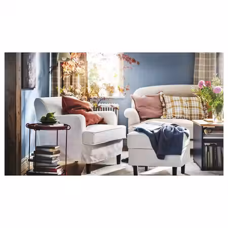 В кресло СТРАНДМОН с подголовником и высокой спинкой, округлыми подлокотниками и мягкой обивкой так и хочется присесть.