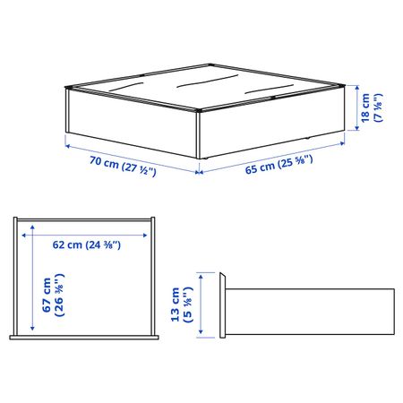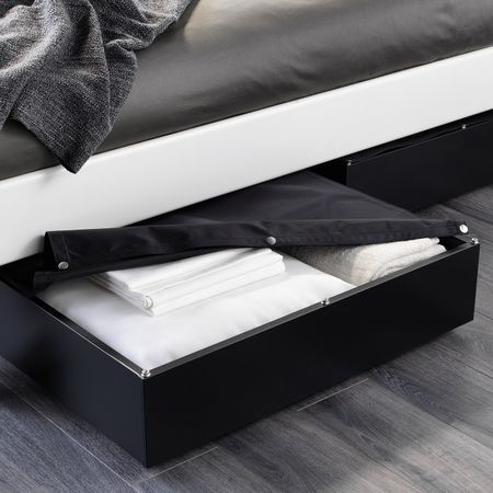 2 больших ящика на колесиках создают дополнительное место для хранения под кроватью. Регулируемые боковины кровати позволяют использовать матрасы разной толщины. Центральная перекладина СКОРВА включена в стоимость, но продается в отдельной упаковке.