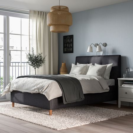 Каркас кровати SLATTUM с мягкой обивкой и изголовьем выглядит стильно и лаконично.