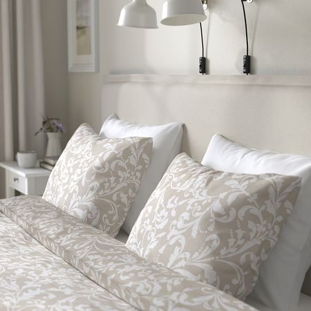 Каркас кровати ГЛАДСТАД с обивкой с кроватными ящиками выполнен в опрятном современном стиле и имеет мягкое изголовье и чехол.